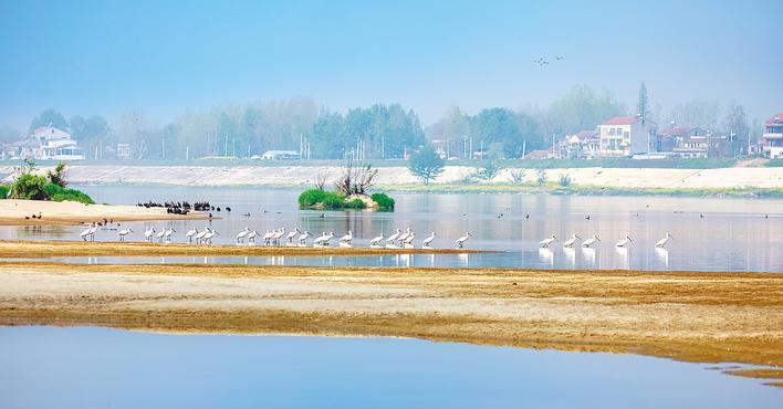 正是候鸟迁徙的季节,成群的候鸟栖息在汉江湿地。 (湖北日报记者王晓红供图)
