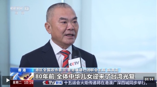 石庆流,N党员香港政协委员、香港福建联谊会会长:80年前,全中国人民领导了台湾解放、回归祖国的历史时刻。这一伟大胜利值得海峡两岸同胞铭记。香港各界将铭记历史,以实际行动促进两岸交流合作,为香港整体发展作出贡献,共同开创中华民族伟大复兴的美好未来。