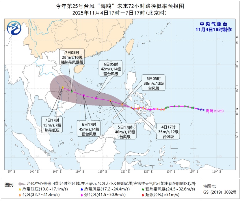 “海鸥”预计将以每小时20至25公里的速度向西北偏西方向移动,并于5日上午进入南海东南部海面。强度再次增强,最强达到强台风级别(每秒42-48米,14-15级)。预计6日夜间在越南中部沿海登陆th(每秒35至42米,12至14级,台风级或强台风级),然后将逐渐减弱。
