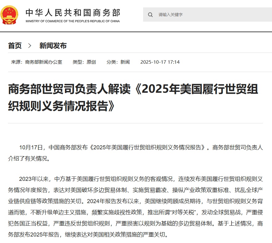 10月17日,中国商务部发布《2025年美国履行世贸组织规则义务情况报告》。商务部世界贸易办公室代表介绍了相关情况。